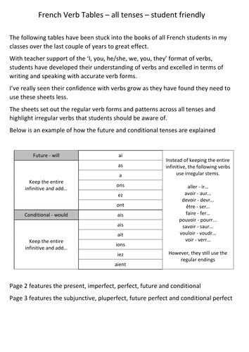 for "French Verb Tables - It explains how to use these tenses and how to conjugate them for regular and irregular verbs."